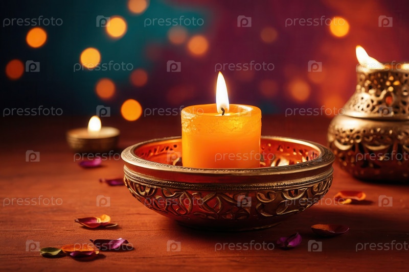 Производительные красочные украшения Дивали с традиционными свечами, масляными лампами, яркими цветами и декоративными мисками копируют пространство