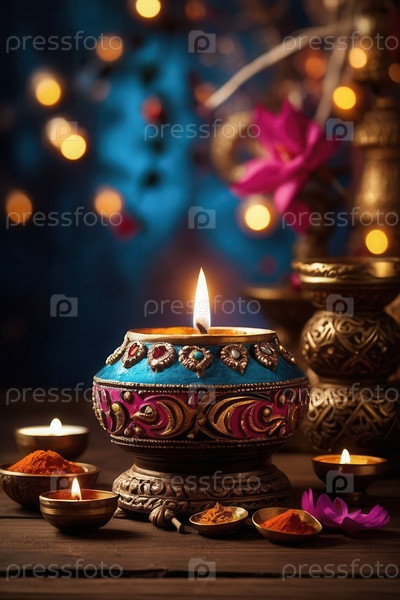 Красочные украшения Дивали традиционные свечи, масляная лампа, цветы и миски копируют ИИ Generative space