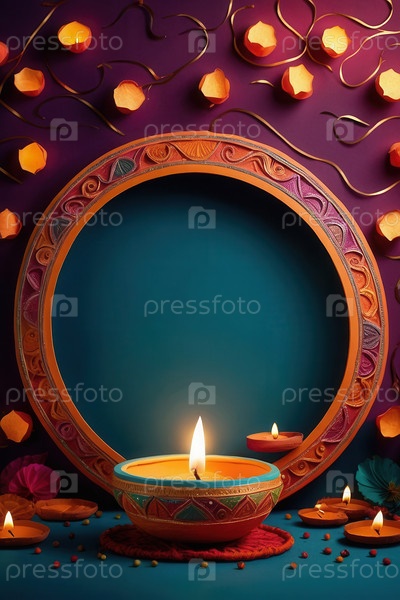 Производительные красочные украшения Дивали с традиционными свечами, масляными лампами, яркими цветами и декоративными мисками копируют пространство