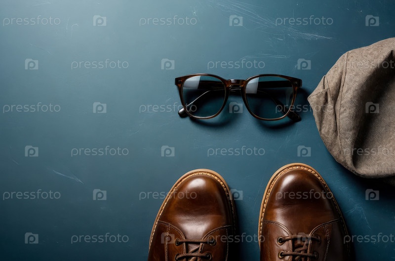 Плоский слой на синем фоне с мужскими аксессуарами, одеждой и очками воспроизводит ИИ Generative space