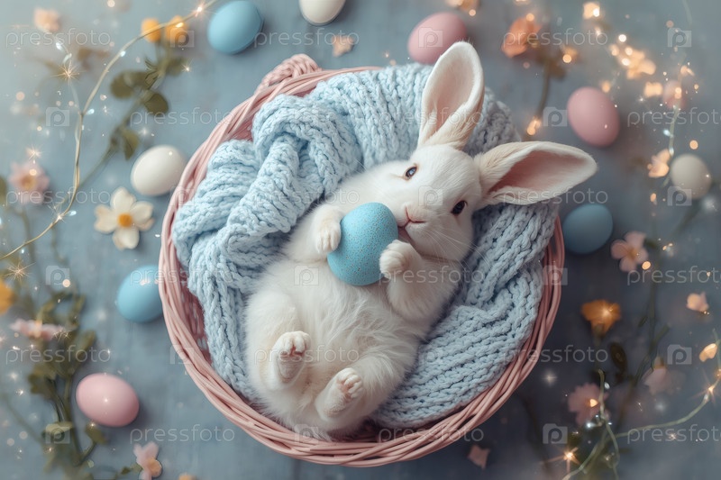 Пасхальный кролик пасхальное яйцо в лапах, лежащее на спине на сером вязанном одеяле в корзине из колючки и уставившееся в камеру
