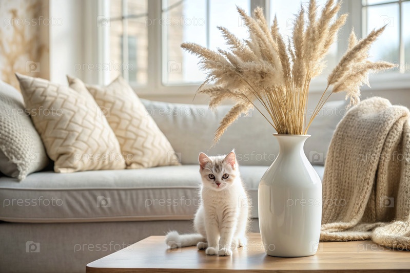 Белый пушистый котенок в современном скандинавском стиле интерьера