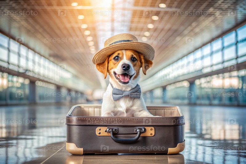 Стильный щенок в путешествии, очаровательная забавная собака в гавайской рубашке и шляпе, сидящая в открытом чемодане