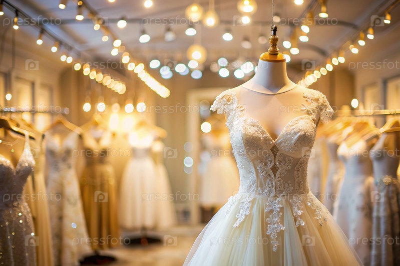 Аренда и покупка свадебных платьев для мероприятий. Близкие. Элегантное белое свадебное платье на манеке в роскошном брачном салоне