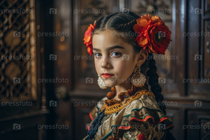 Испанская девушка в традиционном испанском национальном костюме. Перед быком. Бикоборство. Портрет символизирует традиции и культуру народа Испании