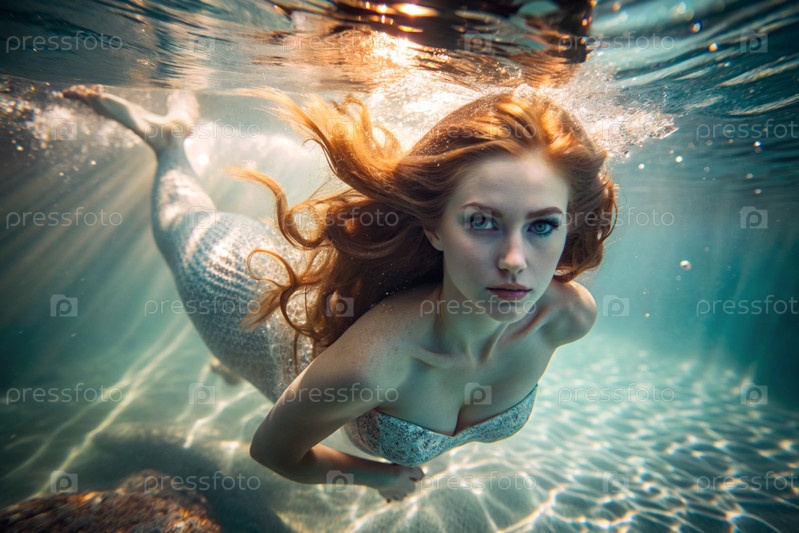 Портрет красивой рыжеволосой русалки под водой