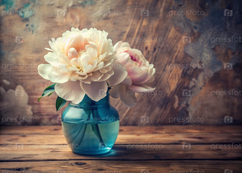 Красивые бело-розовые пионы в стеклянных вазах и бутылки на деревянном шкафчике. Цветы и почки в вазе. Светлый, белый, розовый и синий цветочный фон