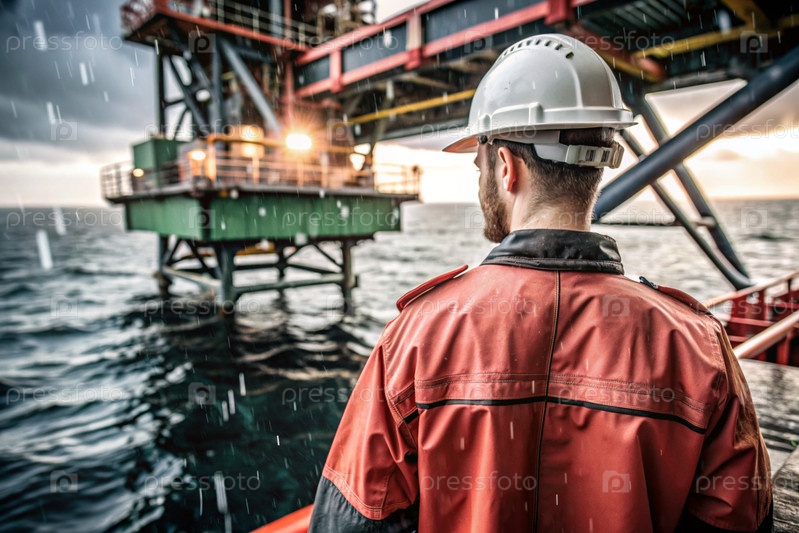 Добыча нефти. Нефтяные скважины и человек в рабочей одежде и строительном шлеме. Нефтяная платформа и промышленное оборудование. Тяжелые условия труда