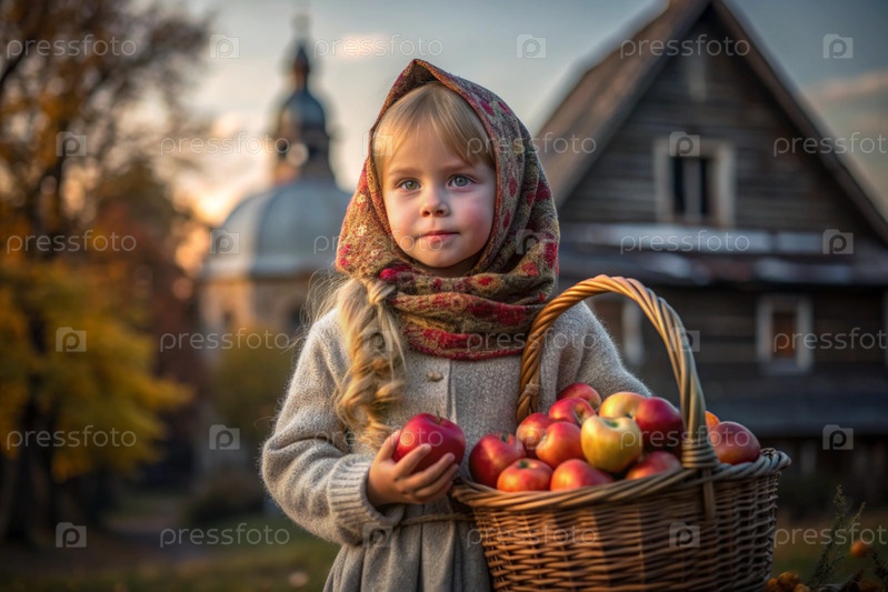 Красивая девушка в русской национальной одежде с корзиной спелых красных яблок на фоне православного храма