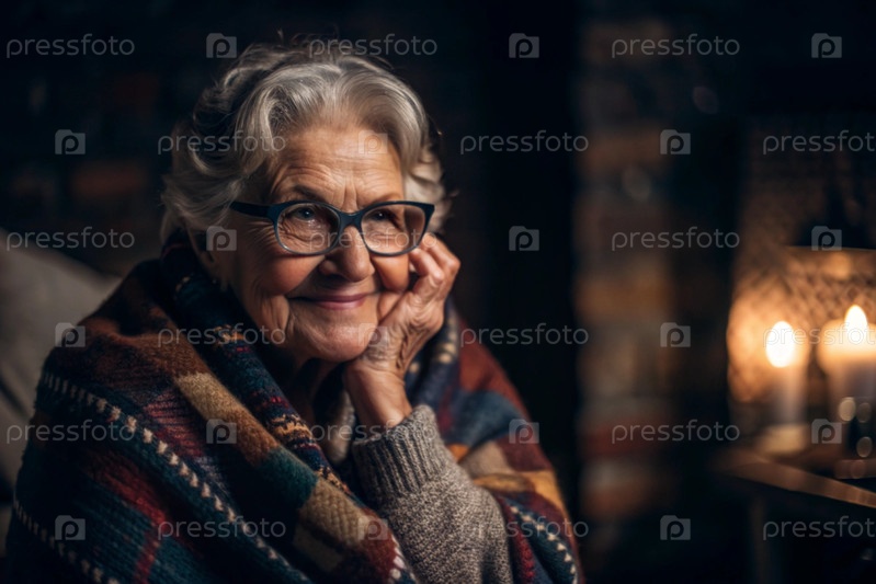 Осенний портрет красивой пожилой женщины, пенсионерки 70 лет. Он завернут в теплую клетку с этническим рисунком. Концепция жизни пожилых людей