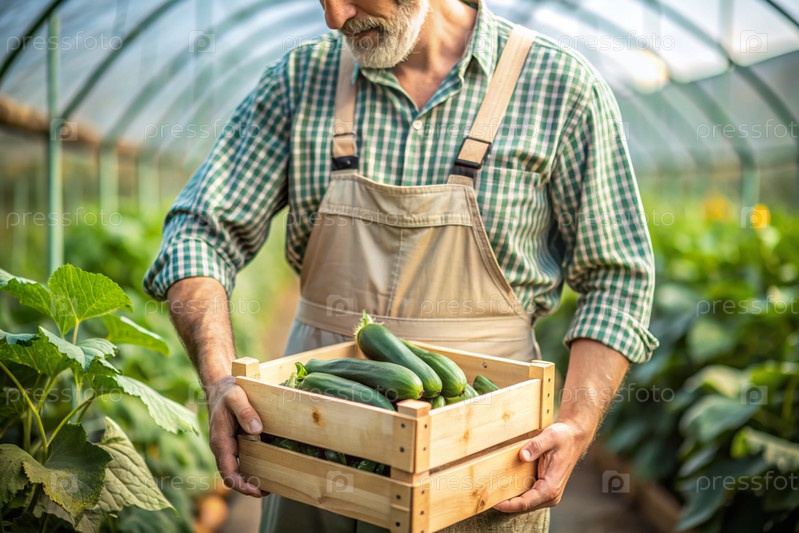 Сельскохозяйственная промышленность. деревянный ящик с огурцами в руках фермера-мужчины. садовник собирает богатый урожай в теплице