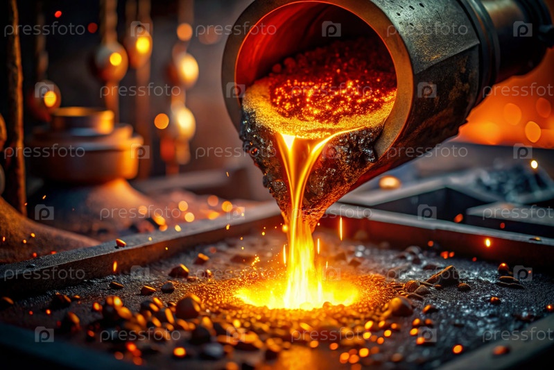 Тяжёлый труд. Фабрика, промышленность, металлургия. Отливка жидкой стали из ведра во время процесса литья в литейной фабрике. Производство металла
