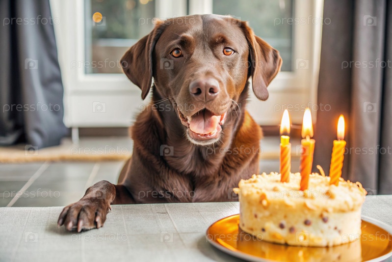Собака сидит с тортом, воздушными шарами и флагами на вечеринке по случаю дня рождения