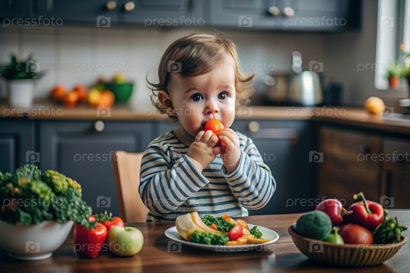 Здоровое детское питание. Первая еда. Кормить ребенка. Милый ребенок ест свежие овощи