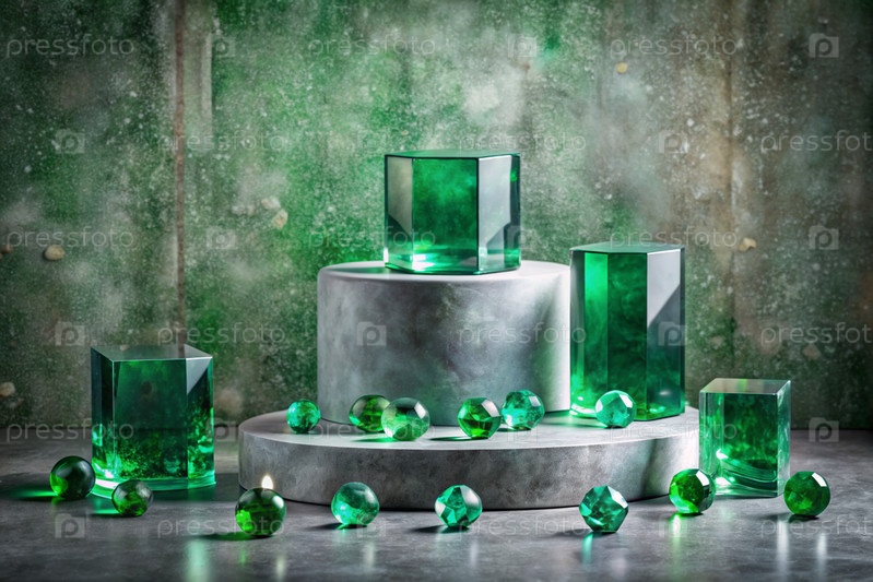 Минималистский фон для демонстрации ювелирных изделий. Современная пустая трибуна с серой стеной и изумрудами. Креативный дизайн презентации продукта