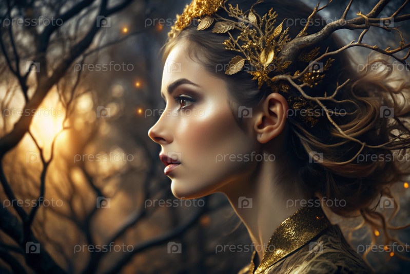 Творческий баннер для салона красоты в черно-золотом цвете. Красивая женщина, окруженная лесом с макияжем и волосами. Золотые ветви дерева в волосах. Индустрия красоты