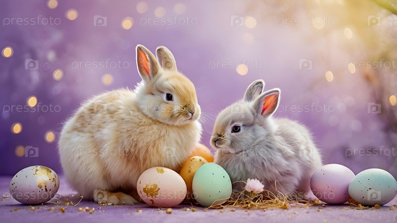 Концепция яркого пасхального праздника: нежные пасхальные яйца, кролики на пастельном фоне