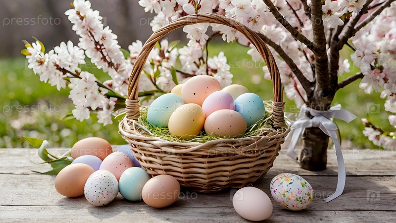Красивый фон с пасхальными яйцами в плетеновой корзине и весенними вишневыми цветами