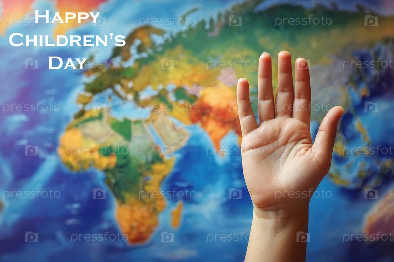 Счастливая открытка Дня детей с текстом и рукой ребенка на фоне цветной карты мира