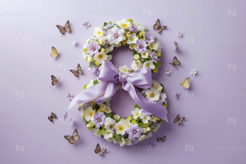 Международный женский день. баннер, флаер, красивая открытка на 8 марта. цветы в форме цифры восемь и бабочки на лиловом фоне