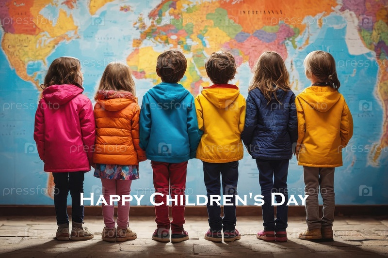 Счастливая открытка Дня детей Текстовая карточка Ребенок должен стоять на фоне цветной карты мира