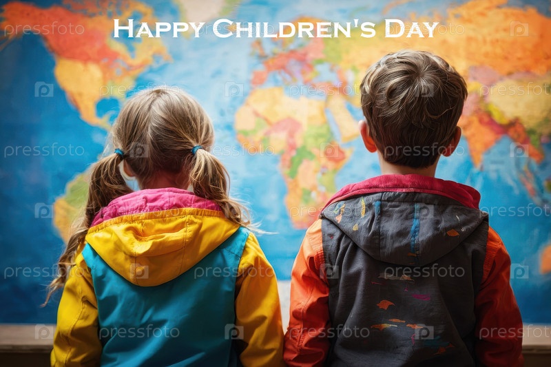 Счастливая открытка для детей с текстом и ребенком на карте мира