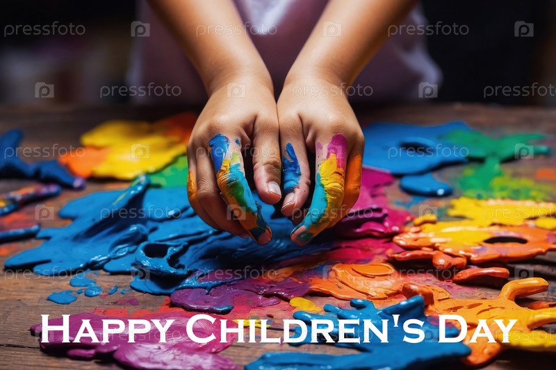 AI Generative Happy Childrens Day открытка с текстом и рукой в цвете