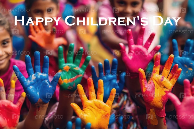 AI Generative Happy Childrens Day открытка с текстом и рукой в цвете