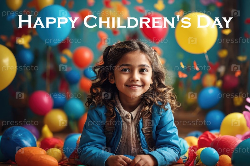 Счастливая открытка для детей с текстом и девочкой на фоне красочных воздушных шаров