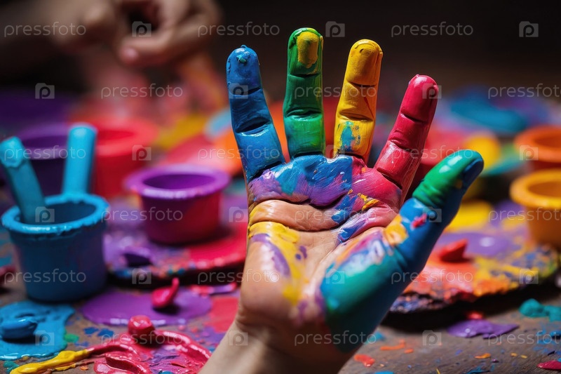 Счастливый день детей Копия открытки Пространство Текст Детская рука в цветной краске На фоне генеративного ИИ