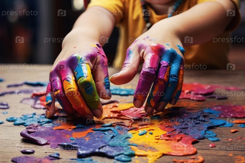 Генеративный день счастливых детей Карточная копия с текстом и рукой ребенка в цветной краске на фоне