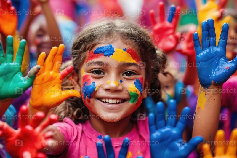 Генеративный день счастливых детей Карточная копия с текстом и рукой ребенка в цветной краске на фоне