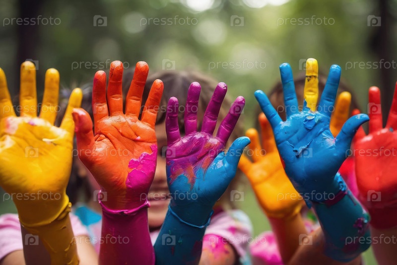 Генеративный день счастливых детей Карточная копия с текстом и рукой ребенка в цветной краске на фоне