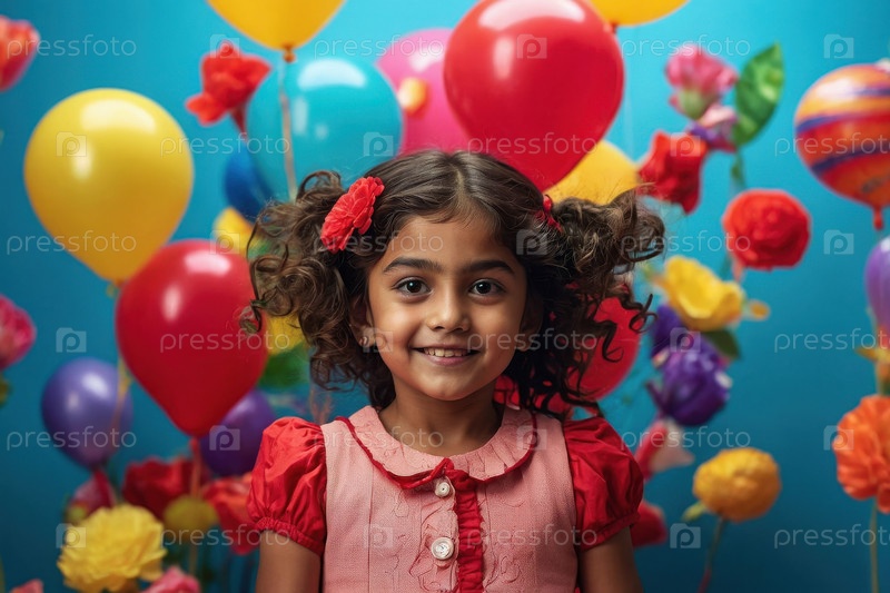 Счастливая открытка для детей с текстом и девочкой на фоне красочных воздушных шаров