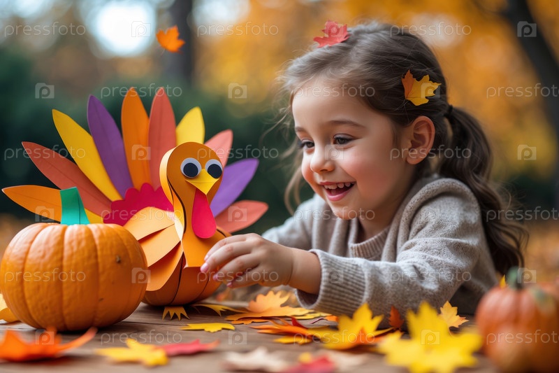 Маленькая девочка делает индейку из желтых листьев и апельсиновой тыквы на День благодарения