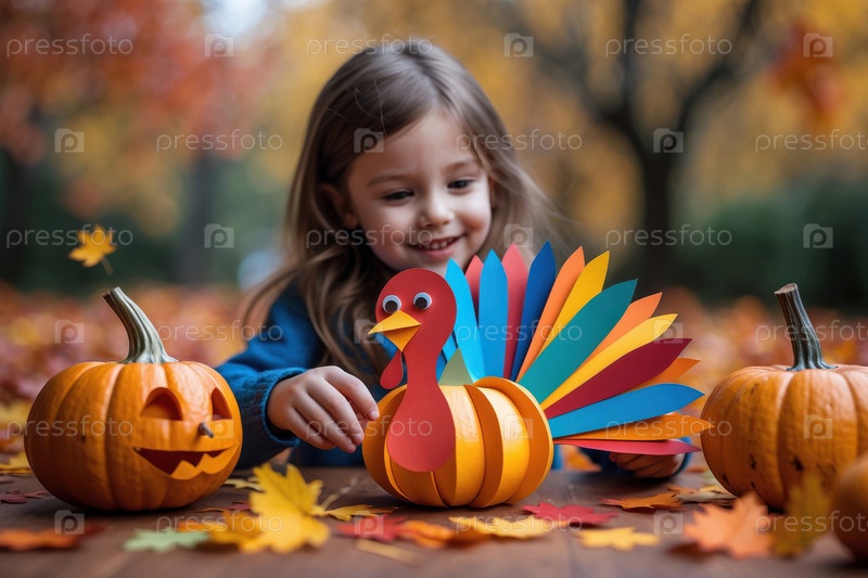 Маленькая девочка делает индейку из желтых листьев и апельсиновой тыквы на День благодарения