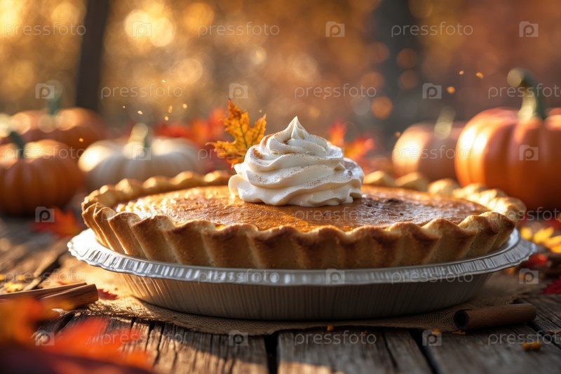 Десерт с коричневым тыквенным пирогом на украшенном столе с апельсиновыми тыквами в День благодарения