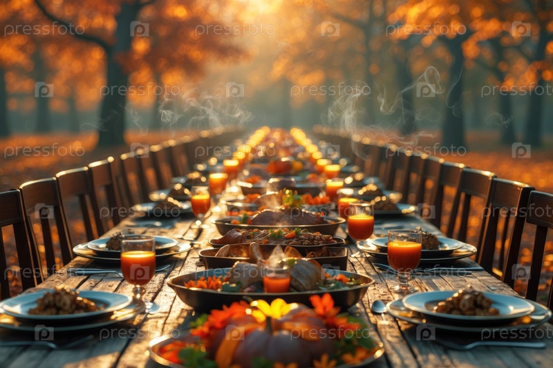 Традиционный праздничный ужин Благодарения с различными блюдами и едой на украшенном столе