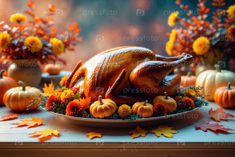 Жареный индей на украшенных столом желтых листьях и апельсиновых тыквах в День благодарения