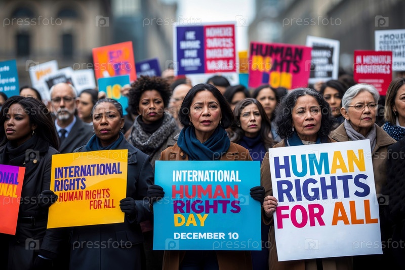 Женщины и мужчины протестуют, люди держат плакаты с надписями о правах человека