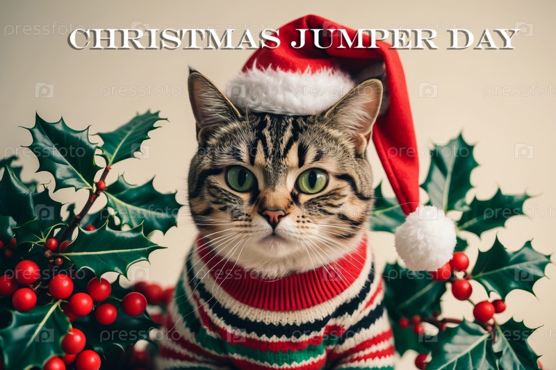 Генеративная карта искусственного интеллекта с пушистым котом в милом свитере и шляпе Санты, приглашение на рождественский свитер