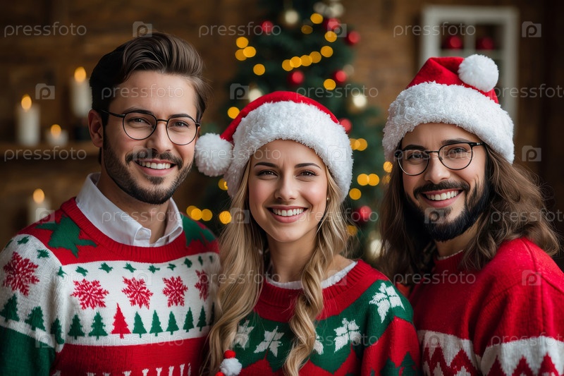Большая группа друзей, мужчины и женщины в рождественских свитерах на свитерной вечеринке