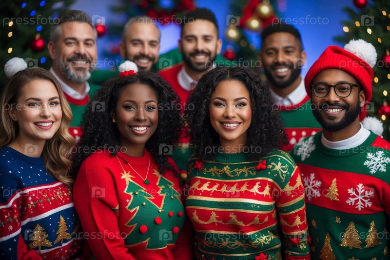 Большая группа друзей, мужчины и женщины в рождественских свитерах на свитерной вечеринке