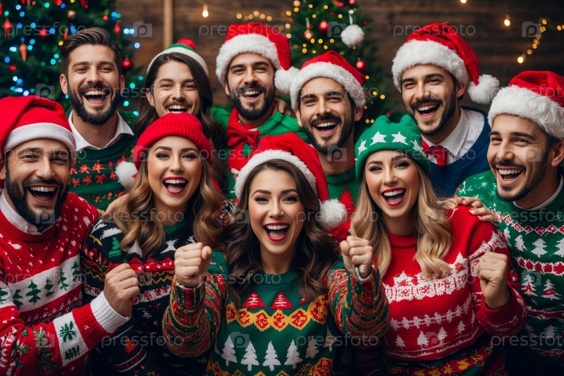 Большая группа друзей, мужчины и женщины в рождественских свитерах на свитерной вечеринке