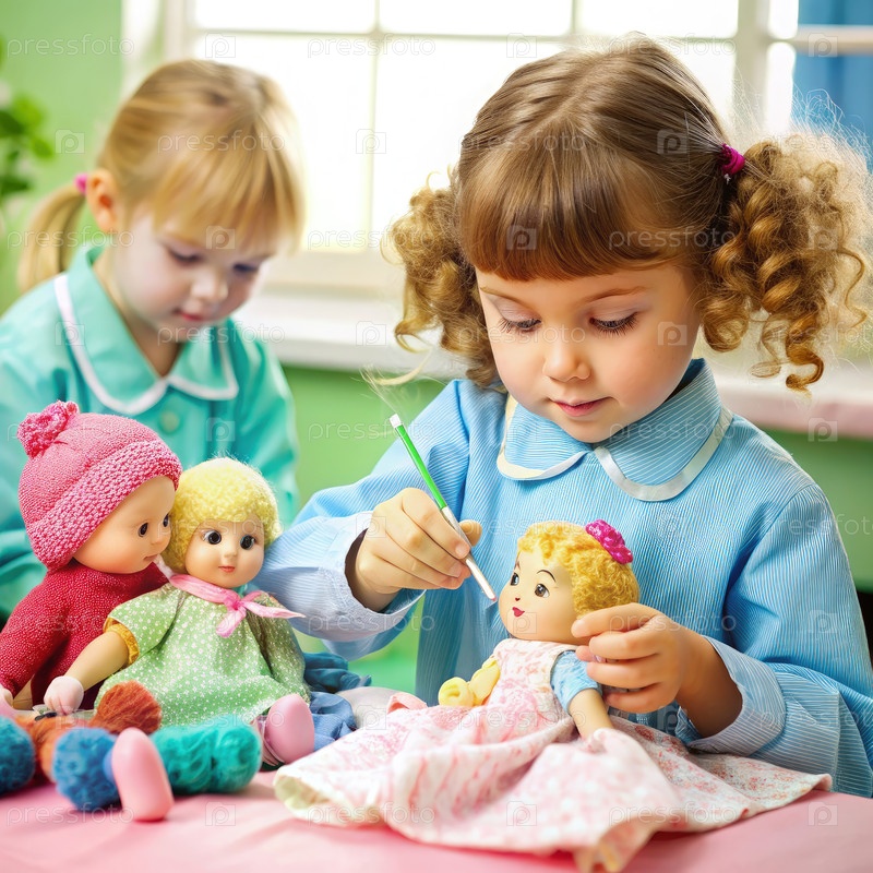 Две маленькие девочки, играющие с куклами за столом
