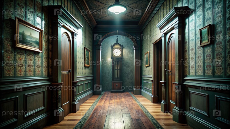Длинный коридор с настенными часами, генерирующими ИИ