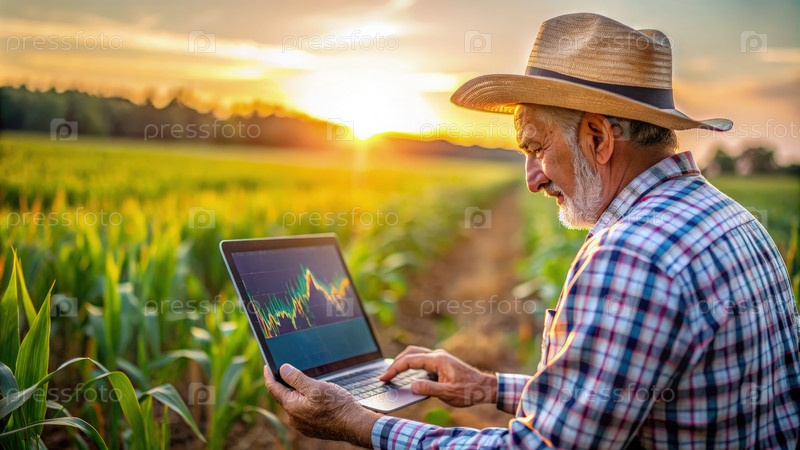 Человек в шляпе использует ноутбук на поле Генерация ИИ