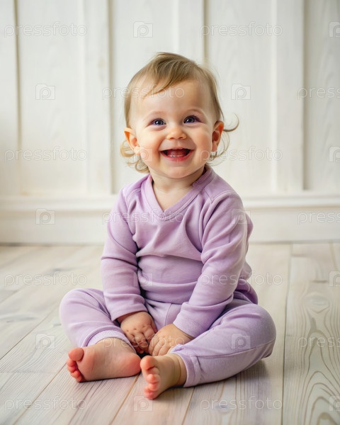 Улыбающийся ребенок в фиолетовом костюме сидит на полу Генерация ИИ