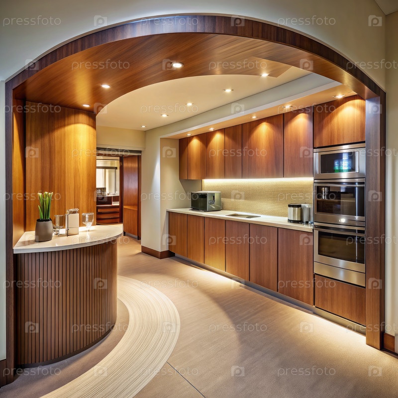 Современная кухня с изогнутыми столешницами и деревянными шкафами