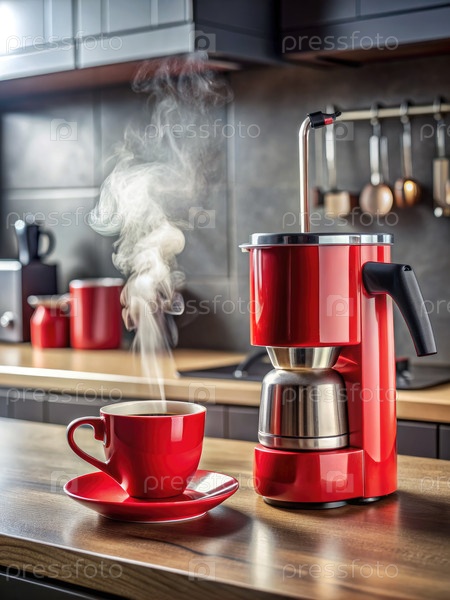 Кафемашина на деревянном столе, генерирующая красный ИИ